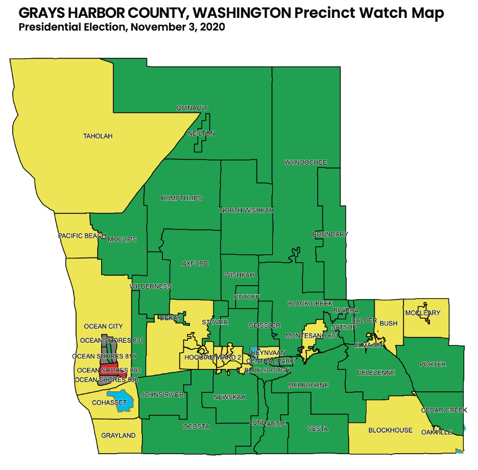 Those three states come as no surprise to anyone watching the electoral situation with eagle eyes. While Washington State is clearly choked out by every method of electioneering known to mankind – mail-balloting, ballot harvesting, Automatic Voter Registration, and the assorted use of technology to adjudicate, tabulate, and otherwise process ballots – the state is organized into so many precincts it is easy to spread out excess ballots. For instance, in Grays Harbor County – a county won by Donald Trump in 2016 and 2020 for the first GOP presidential wins since 1928 – I estimated 7,354 likely fictitious ballots for Joe Biden, which made his losing effort there much closer and in line with a statewide blowout rather than in line with what I believe would have been a race within six points for the presidency and down to the wire for the governorship. However, the map for Grays Harbor looks like this:
