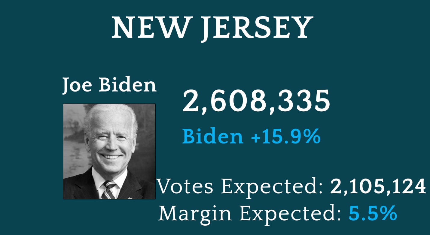 2020: Trump, already with a 3.7% move in his direction in New Jersey, seems poised to make the state competitive, especially after he posts a gain of 281,341 net new votes from 2016, the highest net increase in the state in two decades for a Republican and nearly equal to Obama’s leap from 2004 to 2008; however, New Jersey has begun tinkering with Automatic Voter Registration, 667,000+ net new voter registrations come on board (321,000+ higher than the 2008 Obama surge), and even though Biden appears destined to settle around the 2.1 million Democrat vote mark for the third cycle in a row (and escape with a 5.5% margin of victory in keeping with the state’s rightward drift), Biden comes in at: