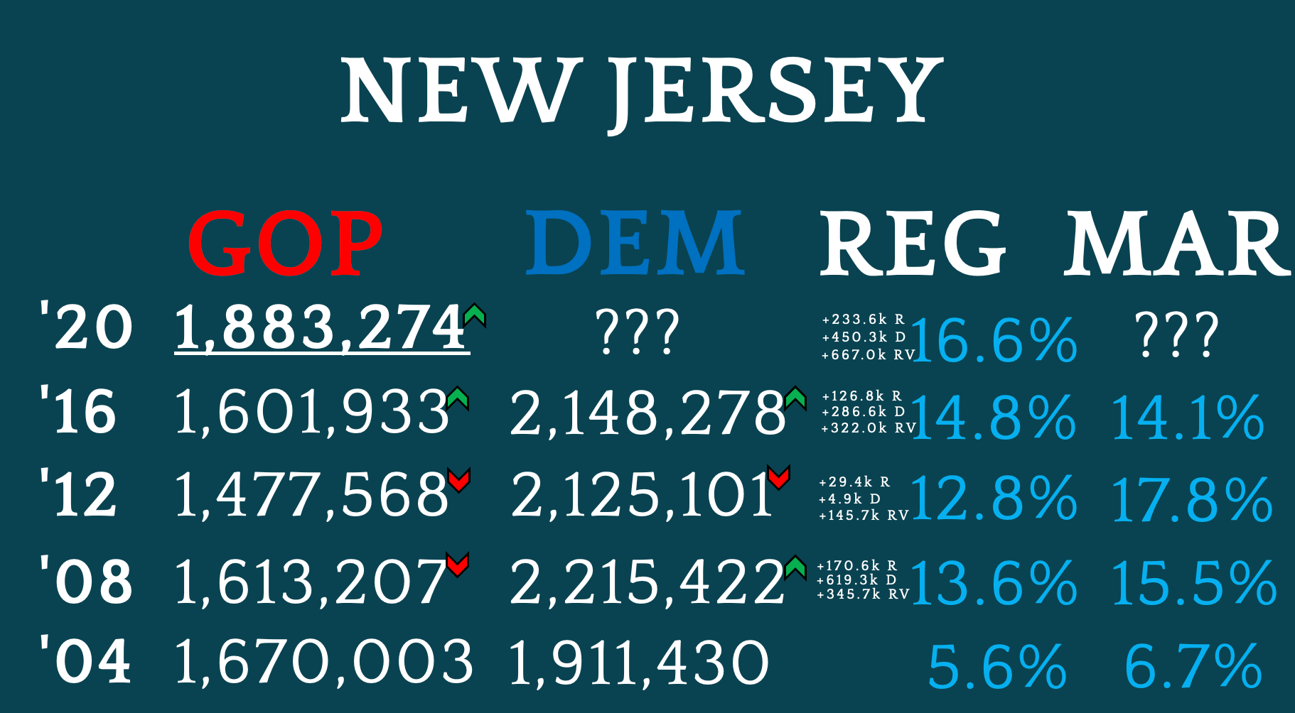 A gain of 460,057 votes – making Obama’s 2008 surge look like a walk in the park. Despite Trump’s sizable gains, New Jersey creeps two points back to the left.