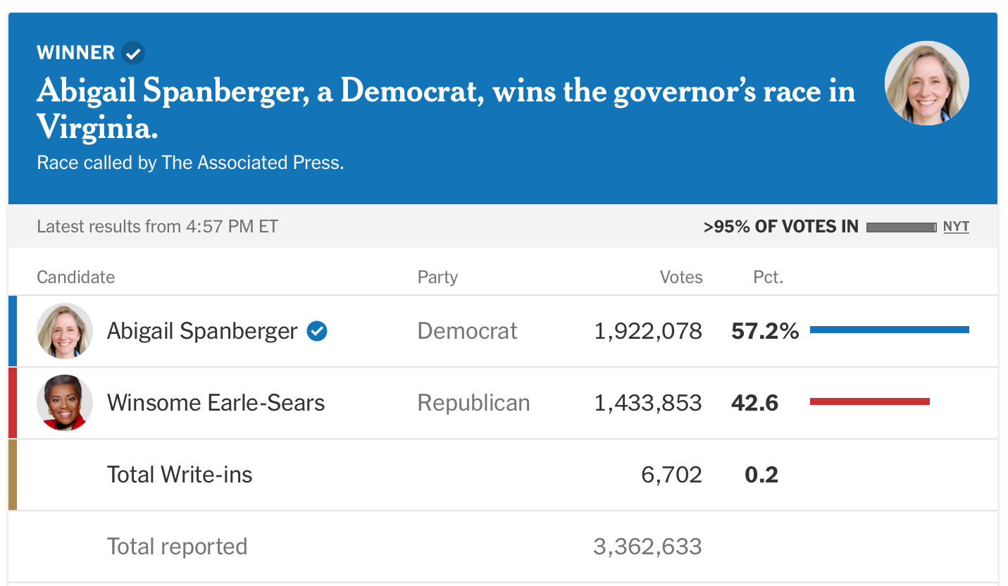 Fewer people turn out. Current ballot totals show 3,362,633 votes cast in the gubernatorial race (Spanberger +14.6%). There were 4,505,941 votes cast in last year’s presidential race, and Trump (in a losing effort) topped Earle-Sears by over 600,000 votes, and Spanberger by over 150,000. Spanberger lags Harris by over 400,000.