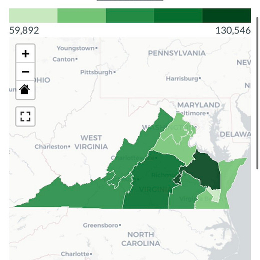 With the lone exception of VA-4, all Democrat districts are lagging GOP-won districts. VA-3, centered on Newport News in the southeast and 43% black, couldn’t give a hoot in hell about this election, and sits over 16,000 ballots behind the next most terrible turnout, VA-8 (Alexandria, Arlington, and Falls Church).