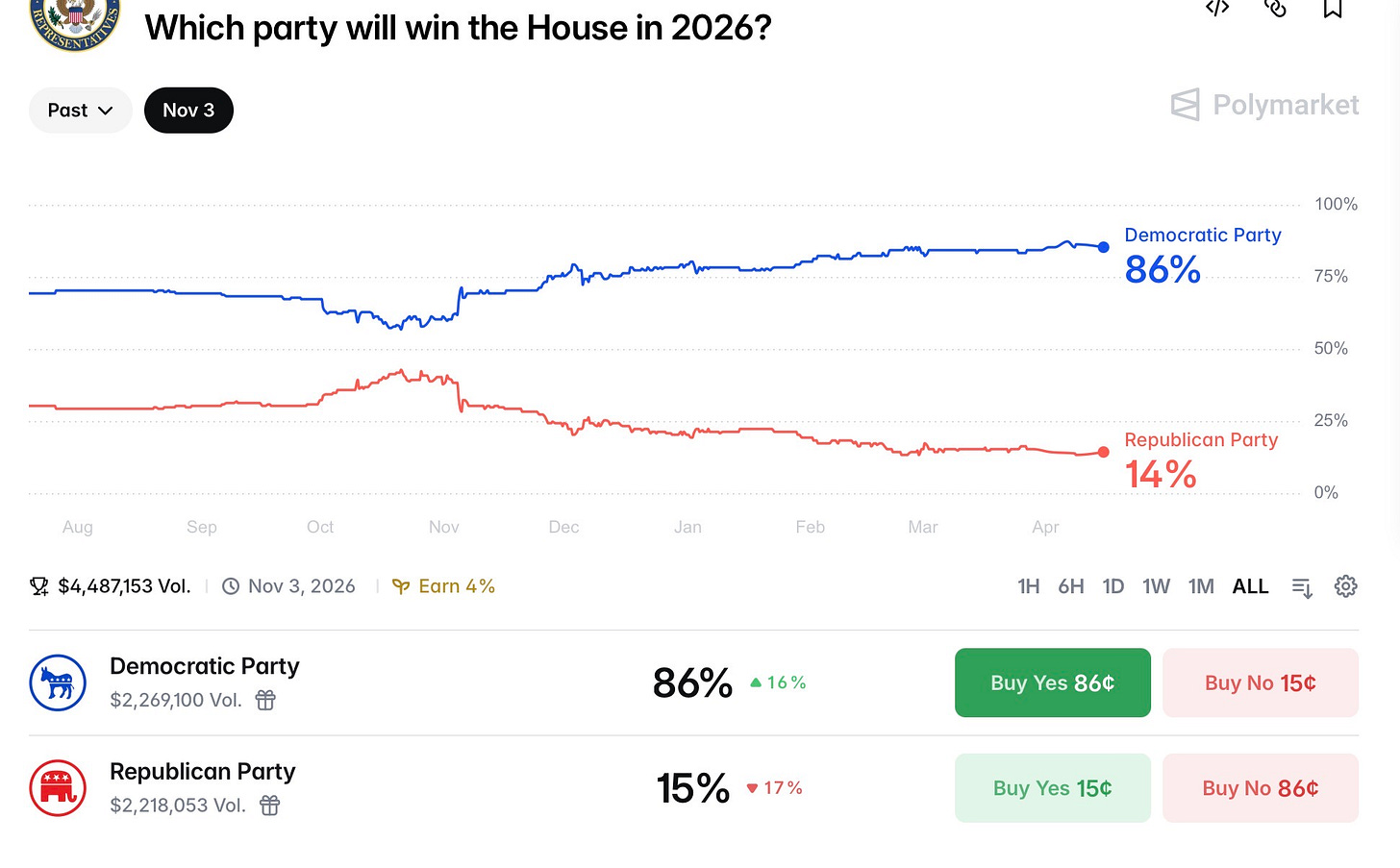 Even if the GOP executes that plan perfectly and only focuses on seats that are winnable, the historical odds still heavily favor Democrats taking over the House next January. The silver lining here is that, thanks to extensive gerrymandering in red and blue states alike, neither party has a high ceiling nor a low floor. I suspect strongly that the winner of the House majority will hold somewhere between 220-229 seats (218 needed for majority). With all of these factors at play, I still give Democrats a 75/25 edge to flip the House - which is 12% lower probability than history would give them to do it based on historical returns. Bettors on Polymarket favor them even more than I do: