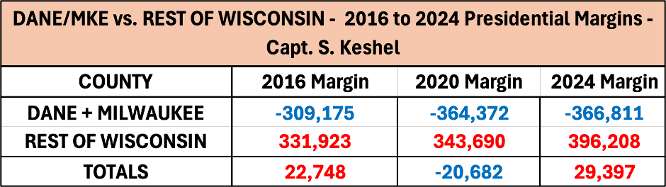 I am confident harvesting rings exist in the far western portion of the state nearest the Twin Cities of Minnesota, and in the northeastern portion near Green Bay (Brown County), but with urban decay like that found in Milwaukee County, misery inevitably spreads to suburban areas and counties that have been insulated from such malaise, often for many decades (ask residents of Chicago’s collar counties if you don’t believe me), which now all vote Democrat.