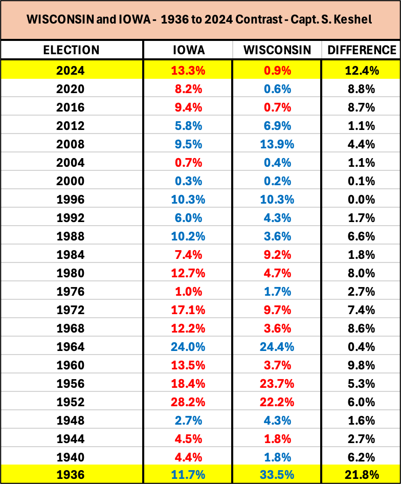 · Iowa and Wisconsin, with a gap of 12.4% between the two, finished further apart than they have in any presidential election since 1936, when Franklin Roosevelt beat Alf Landon in both, by 11.7% and 33.5%, respectively. The two states had been just 8.8% apart on average in the two Trump races, and curiously, Trump had a clear majority of the vote in Wisconsin when the race was called for him, suggesting he should have won the state by at least 4 points: