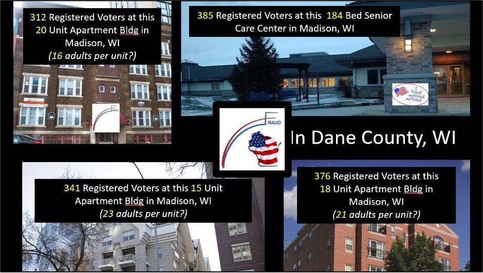 The unrealistic 3 to 1 Democrat margins are buoyed by mail-in ballot fraud likely tied to fraudulent registrations of college students, particularly those who have moved on and are no longer eligible to vote in Dane County. I believe this because I’ve seen the canvassing statistics in the county which show impossibly high amounts of voters supposedly registered under the same roof. Grassroots patriot Erin Yager gave me this slide three years ago::