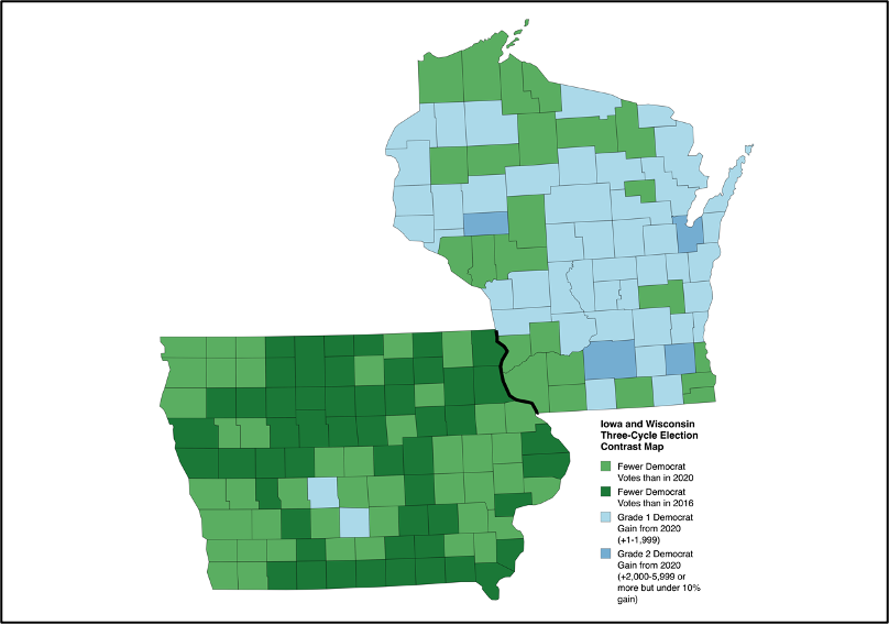· How should things have turned out in Wisconsin? If you haven’t read my review of Iowa yet, now is a good time to do just that. While Harris lagged Biden in 24 Wisconsin counties, she didn’t lag Hillary Clinton’s 2016 ballot counts in any of the Badger’s State’s 72 counties; however, she managed to gain ballots in just 2 Iowa Counties in minuscule amounts, and lagged Clinton in 52 counties there:
