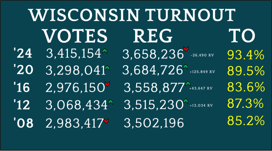 Turnout, until recently, has generally been expressed as votes divided by registered voters. The U.S. Census Bureau, despite its incompetence and corruption, estimates 5,910,955 people live in Wisconsin as of 2023. With 3,658,236 registered voters entering Election Day, 61.9% of Wisconsin’s total population was registered to vote, which is lower than Pennsylvania’s percentage, and far lower than Michigan’s, which isn’t even within bounds of legality. With 3,415,154 presidential ballots counted, turnout was 93.4% (3,415,154/3,658,236), which is Soviet Union-level high and not realistic. To make this number more realistic, Same Day Voter Registration alters the denominator and subsequently, the turnout, but you only find out after the fact: